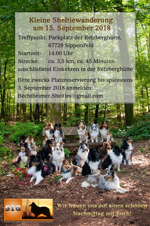 Wandern mit Sheltie – Am 15. September 2018 trafen sich Sheltiefreunde um gemeinsam Wandern zu gehen und einen schönen Mittag im herbstlichen Wald bei Sippersfeld zu verbringen. 13 Sheltiefreunde mit ihren Hunden waren der Einladung gefolgt. Treffpunkt war der große Parkplatz am Sippersfelder Weiher. Von dort aus ging es auf einem angenehm zu laufenden Rundrundweg um den Weiher zur Retzberghütte. Bei gutem Essen, erfrischenden Getränken und vielen informativen Gesprächen, natürlich über unsere Shelties, ließen wir dort den Tag ausklingen. Danke für die gute Organisation. Wir kommen gerne wieder.